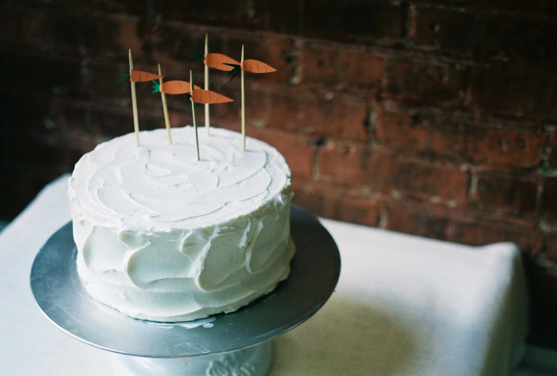 /I've never really felt one way or another about carrot cake. I mean, I recognize it as a classic and all but I wouldn't really say that it was in my repertoire until I was challenged to a carrot cake cook off over a game of cards last spring. Well friends, I love a good competition and I really love hanging out with other folks who like to bake so I immediately accepted and imagined a big blue ribbon pinned to my chest. When the time came I tested and labored and fretted over the cake then over the frosting. I settled on a dairy and egg free cake (wacky I know) that was the moist, slightly spicy cake of my dreams. For the frosting, I knew that I wanted to go a little non-traditional because I've never really been a fan of the extreme sweetness of traditional cream cheese frosting. I turned to my favorite swiss buttercream with hopes that it's smooth texture and subtle sweetness would lend itself to the addition of cream cheese. I whipped up a batch and enriched it with some tangy cream cheese and the tiniest bit of lemon zest and my goodness. I had created a buttercream that tasted like fluffy whipped cheesecake, victory was mine! The day of the Carrot Caketacular came and I packed up my prize winner in a wicker basket, hopped on the subway and hoped for the best. Five cakes were offered up to the masses, votes were cast, fingers were crossed and no one was more shocked than me when my cake fetched second place. What?! Second Place?! It was a pretty narrow margin between me and #1, so I blame the raisins. I was the only one who used 'em and I guess there were a lot of raisin haters there that day. Not even my revolutionary frosting could save me.