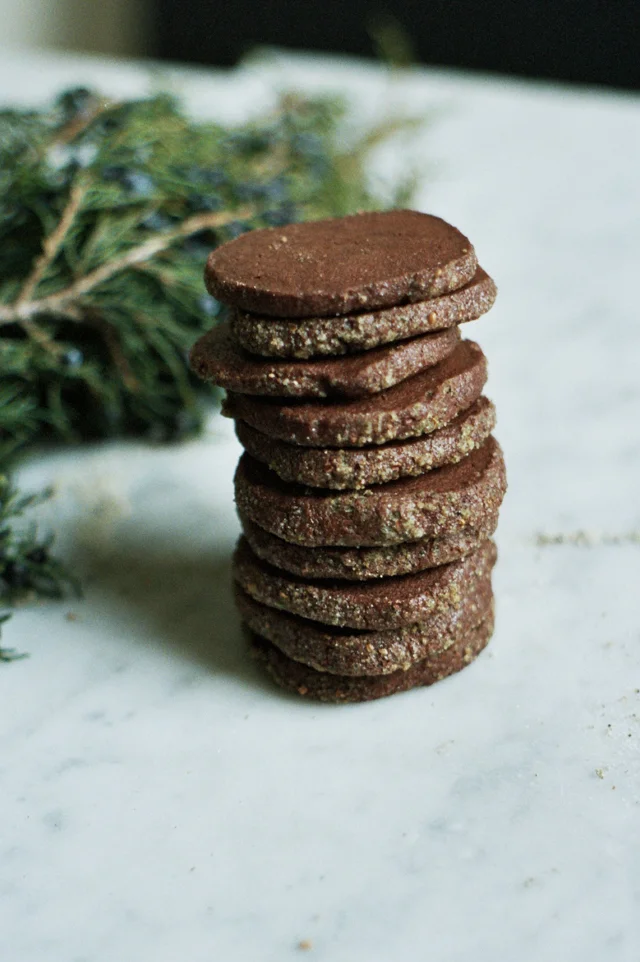 Wong. Tama is a forager and conservationist and every winter she collects the berries of the eastern red cedar trees near her home in New Jersey to sell to restaurants in New York. This year, I was lucky enough to get some too! The berries (technically cones) are slightly sweeter and less harsh than commercially available dried juniper berries and they smell absolutely wonderful. When I tasted the juniper sugar, I knew it's sweet foresty flavor and subtle woodsy notes would be just the thing to add to my holiday treat arsenal so I stirred up a batch of my favorite chocolate sablé dough and coated it with the sugar before slicing. The result is a wonderful holiday flavored cookie, perfect for gifting.