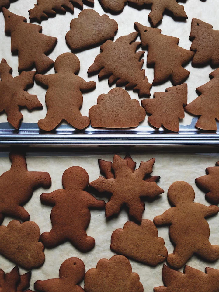 Working with 1/2 of the dough at a time roll the dough 1/8-1/4-inch thick on a lightly floured surface using a lightly floured rolling pin roll. Use a cookie cutter or stencil to cut out desired shapes then place them on the prepared baking sheets. For cookie ornaments, use a skewer to poke a hole through the top of the cookies before baking. Bake for 8-10 minutes or until the edges of the cookies have just barely begun to brown. For cookie ornaments bake the cookies until they are lightly browned all over and firm to the touch. Cool the cookies on the sheet pans for a few minutes and then transfer to a cooling rack to cool completely. Decorate as desired.